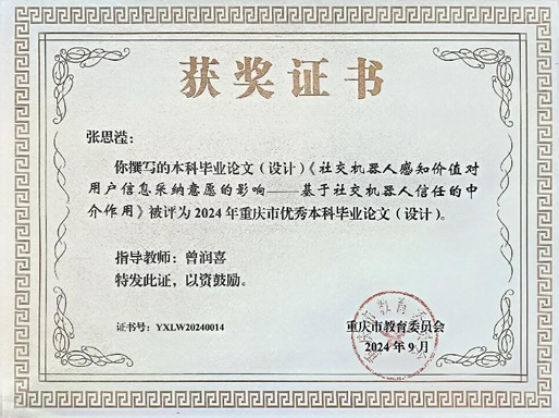 近日,重庆市教育委员会公布2024年重庆市优秀本科生毕业论文(设计)评审结果,我院2020级新闻学专业本科生张思滢撰写的《社交机器人感知价值对用户信息采纳意愿的影响——基于社交机器人信任的中介作用》(指导教师为曾润喜教授)获评重庆市优秀本科生毕业论文。
