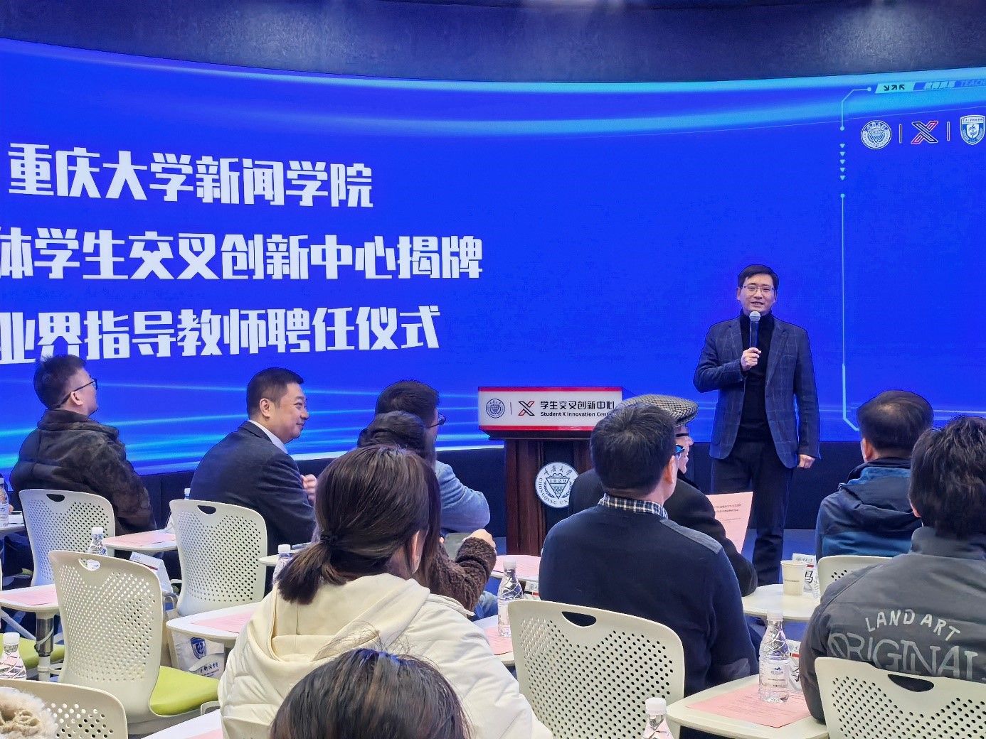融媒体学生交叉创新中心下设融合新闻实践工作室(学生通讯社)、新闻评论工作室、品牌传播工作室、卓越新闻传播实践工作室、口述史工作室与视听创意传播六个工作室。仪式现场,刘丹凌教授、刘海明教授、马二伟教授、李金正副教授、李松蕾副教授与范虹副教授接受聘任。