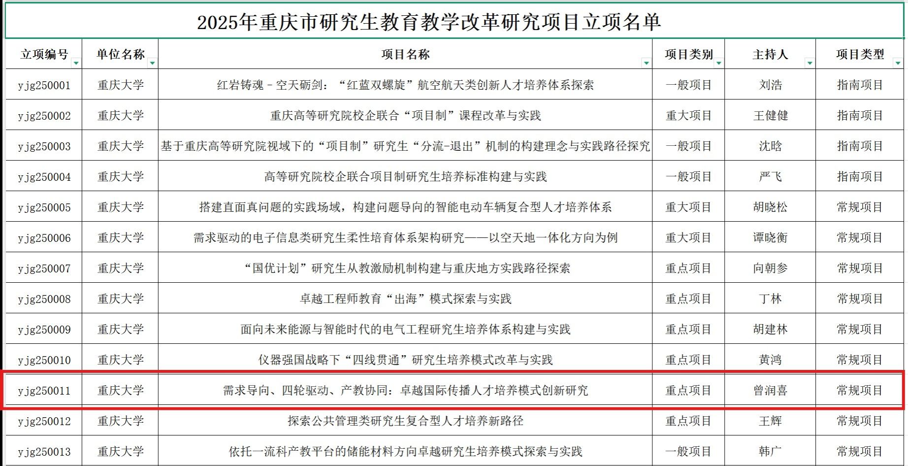研究生教育教学改革研究项目的立项名单。我院共3项课题获得立项,喜获丰收:其中重庆市市级重点项目1项,一般项目1项,成人电影
