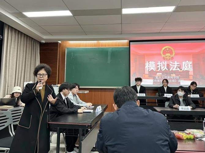 《传媒伦理与法规》本科生课程的课堂热闹非凡。杨秀教授邀请重庆市南岸区人民法院周俐莎法官走进课堂,对三组学生的“情景剧视频展播+模拟法庭实操”成果进行专业点评。同学们按抽签顺序依次登台展示,全程穿插法官与授课教师的精准点评,最终评选出一、二、三等奖并现场颁奖,为本次“传媒+法治”实践教学新形式画上圆满句号。