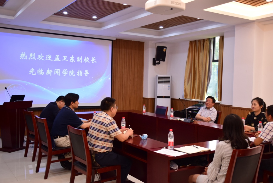 会议由凌晓明主持。他首先对孟卫东副校长的到来表示热烈欢迎,并逐一介绍了参与座谈的各位骨干教师。董天策代表学院领导班子进行工作汇报,详细介绍了学科评估准备、卓越新闻传播人才培养、实验室建设等学院当前的工作重点。