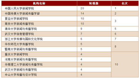 查阅官方网站发布的排行榜,新闻传播学学科高等院校转载全文245篇,约占本学科转载总数(306篇)的80.1%,排名方式是对3篇以上的高等院校所属机构分学科排名,进行转载量和综合指数计算并选取前10名进行排序。