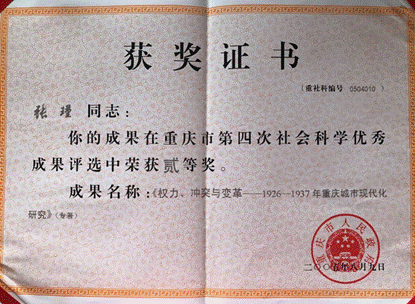 223日,重庆市地方史研究会举行成立三十周年座谈会,会上公布揭晓了“改革开放40年重庆史研究重要学术成果”。我院张瑾教授著作《权力、冲突与变革—1926-1937年重庆城市现代化研究》入选“改革开放40周年重庆史研究优秀成果”。该书于2005年获得重庆市第四次社会科学优秀成果二等奖。