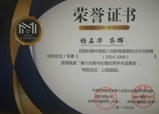 本次学术年会的重要议题之一是对入选“首届中国媒介法规学术年会优秀学术成果奖获得者及其获奖作品”进行表彰。齐辉研究员的论文《民国时期中国报人对新闻道德的讨论与突围(1914—1949)》和其他12部著作(论文与专著)共同获得了首届中国媒介法规与伦理学术年会优秀学术成果奖。
