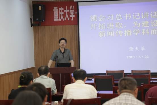 随后,董天策院长以“领会习近平总书记讲话精神,开拓进取,为建设一流的新闻传播学科而努力”为主题,给全体党员讲党课。董院长从“ ‘鼎新’带动‘革故’,创新决胜未来”、“深化科技体制改革,充分释放创新潜能”、“努力成为世界主要科学中心和创新高地”、“坚持党对科技事业领导,描绘科技强国蓝图”等几个方面来分享自己学习讲话精神的体会。结合学校“双一流”建设和内涵发展的要求,董院长提出要聚焦“双一流”,努力开拓进取的行动目标,并分析了“2018广州日报大学新闻传播学一流学科排行榜”中我院新闻传播学学科排位的变化情况,认为从评价指标来看,人才培养指数偏低,严重影响了学科的整体发展。在今后工作中要加大整改力度,补齐人才培养的短板;要求广大教职工要有危机意识,敢于争一流,拿一流项目,出一流成果。
