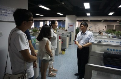 张德泽副总裁带同学们参观了包括成人电影、视听中心、新媒体事业部、全媒体中心、网络问政中心在内的数十个部门,并生动形象地讲述了华龙网的创新发展战略模型:以新闻立网为机首引领方向,以技术集成和创新服务为两翼稳定飞翔,以产业集群为机尾提供不竭动力。同学们近距离观察网络媒体现场的工作流程、认识到出色媒体人应具备的基本职业技能。