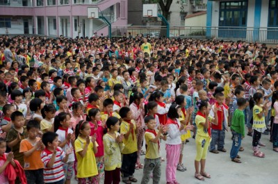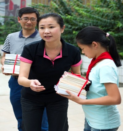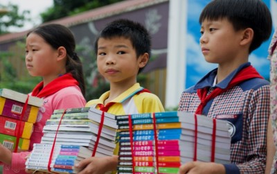 (接受赠书的小学生们)