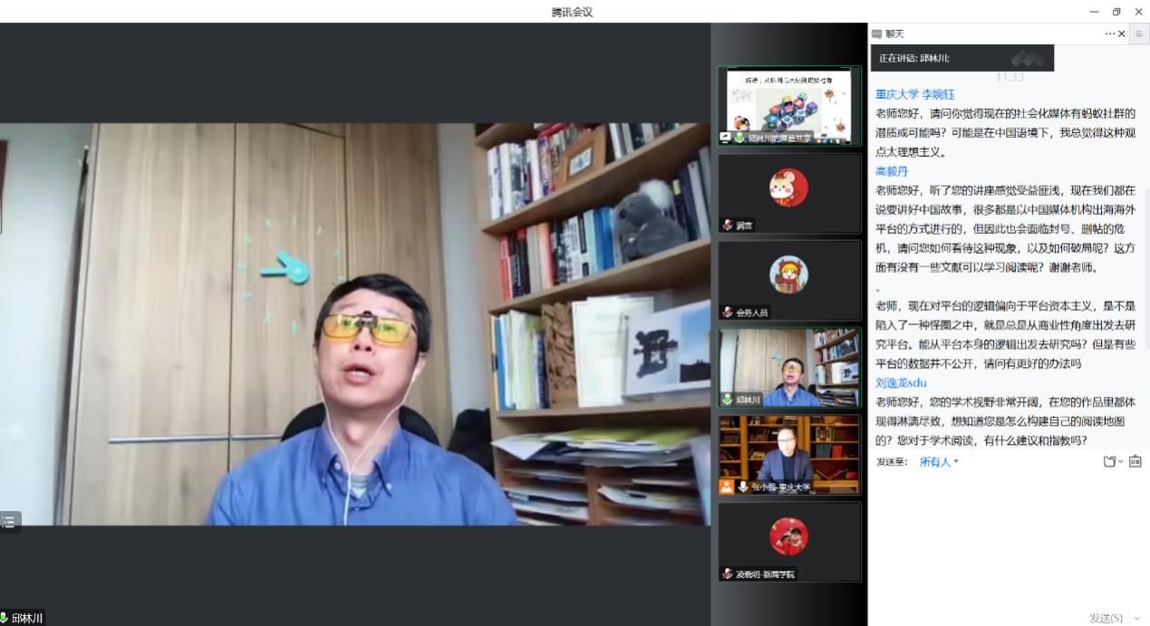 在互动环节,学员提出“中国社会化媒体是否存在蚂蚁社群的可能”,“如何在外国掌握的社交平台讲好中国故事”,“如何构建自己的学术阅读地图”等问题,邱林川教授做了详细解答。邱林川教授认为,蚂蚁社群作为第三条路径,可以被用来研究中国语境下的具体问题;面对讲好中国故事这样的实践问题,要意识到三种路径在现实中组合的可能性,要打开思路、发挥理论的想象力;进行学术阅读,一定不能只追逐新的东西,要回到过去的经典中发现历史和当下的共通之处。