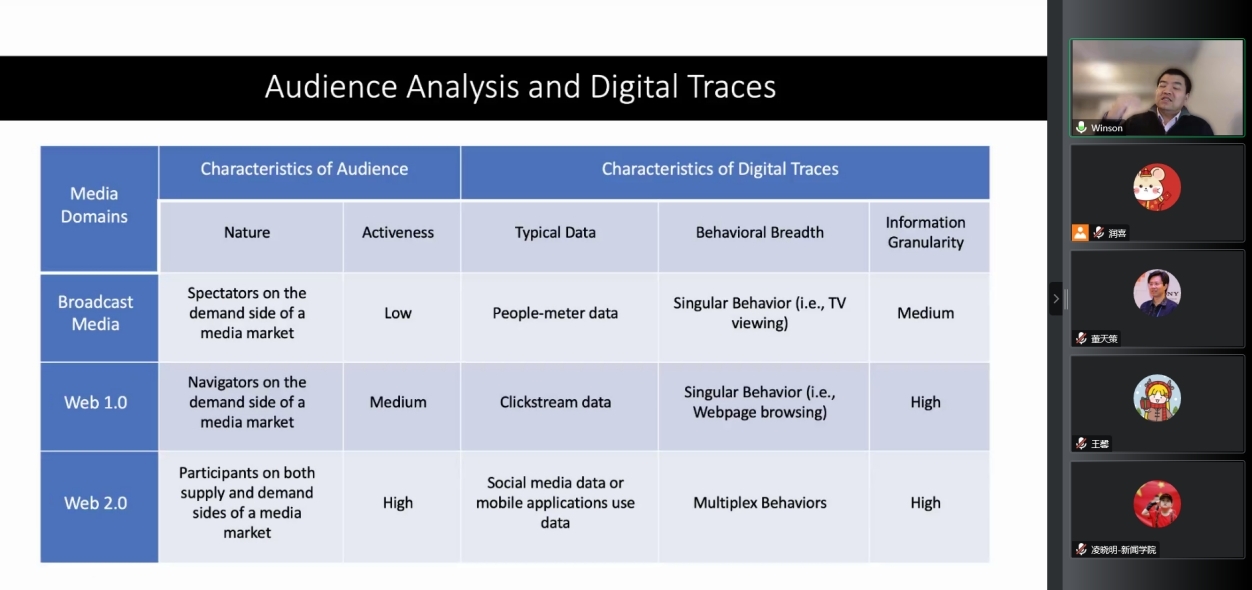 彭泰权教授认为,时间为人类行为研究提供了新视角和新解释。时间棱镜(Temporal Lens)具有概念直观与经验直接的特点,以时间棱镜来理解和观照人类行为,可以把握特定时间里人类行为的出现频率、持续时间,以及不同行为的时间分配情况等。基于互联网传播产生的各种“数字痕迹”(Digital Traces),将变革人们对于受众行为的认识。相较于以往的人类行为数据,这些数字痕迹获取便捷、精细度高,并且具备统一标准以及跨平台可比性特点。彭泰权教授分析了广播电视时代、Web1.0时代、Web2.0时代在受众特征以及数字痕迹特征方面的区别,发现从媒体市场的需求方到供需双方的参与者,受众的主观能动性都在不断提高。