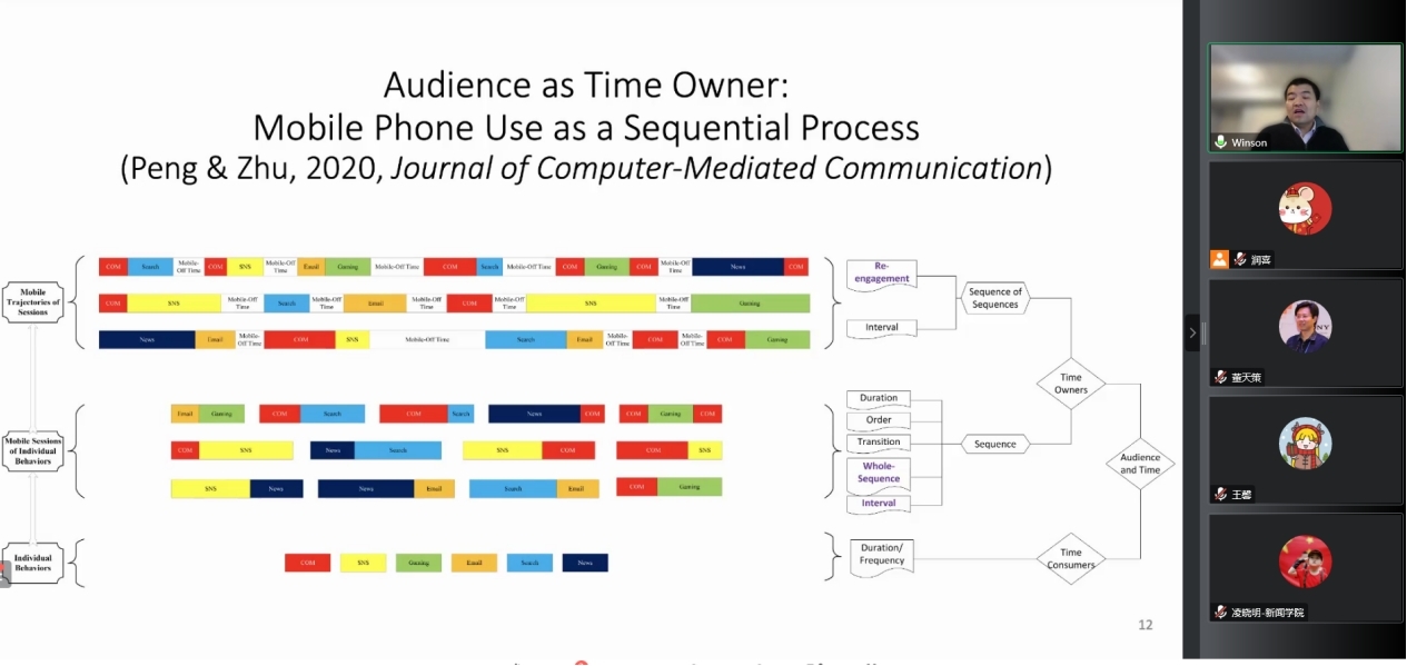受众与时间究竟存在何种关系?彭泰权教授认为,以往研究通常将受众视为消费者,将时间视作一种独立于人类而存在的、可塑造人类行为的资源。这一观点低估了受众对行为的控制力,丰富的时间信息也被简化为有关持续时间、强度、频率等的综合度量(Aggregate Measure),并未反映人类行为的全貌。“受众是时间拥有者”的观点则阐明了时间与受众行为的关系:时间是在人类行为中形成的,来自与之相关的受众行为。这一观点将时间视作一种多维概念,反映出人类在行为调度中的能动性,能够对在线行为进行选择、排序、转换等。彭泰权教授为讲习班学员分享了团队基于移动媒体挖掘测量“时间”概念的研究成果,主要涉及作为序列过程的手机使用行为研究(Audience as Time Owner: Mobile Phone Use as a Sequential Process)和行为轨迹中的移动再参与研究(Mobile Re-engagement in Behavioral Trajectories)等。