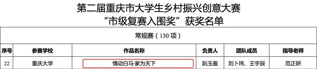 共有12支团队通过专家初筛入围市级复赛。最终,《“白马峥茗”——新时代白马山贡茶的“生命力”》《思高山古韵 品贡茶千年——武隆仙女红茶文化创意包装设计方案》获二等奖,《“林距离,森呼吸”——武隆白马山森林氧吧之旅》获三等奖。《情动白马·家为天下》获入围奖。