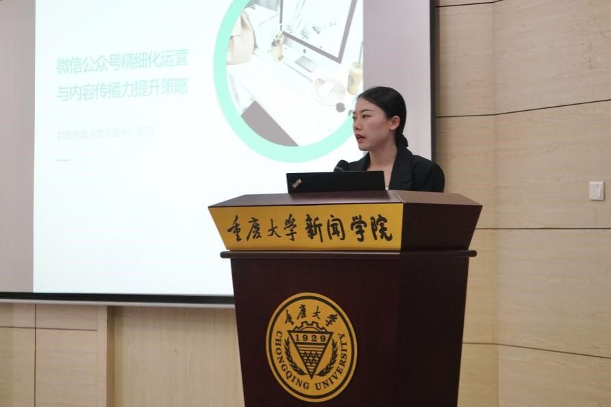 陈雨从应用与实操方面向同学们阐述了微信公众号的精细化运营与内容传播力提升策略。她从账号搭建与定位技巧、经典爆款套路拆解、内容涨粉与用户粘性提升、公众号内容运营制作问题与解答、常见差错分析与运营工具推荐等五个方面作了分享,为同学们在新媒体平台的运营和制作提供了许多新的思路。