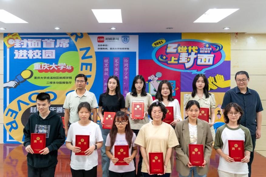 副院长郭小安、封面新闻副总编崔燃为学生代表颁发封面青年通讯团校园记者聘书。