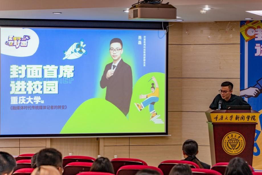 封面新闻科技新闻部副总监燕磊、运营传播中心资深内容运营陈雨分别进行主题宣讲。燕磊结合从事媒体记者的个人经历,从兴趣和热爱、成长与探索、创造与未来这三个方面,讲述融媒体时代传统媒体记者的转变。他与同学们分享在记者生涯中的感悟,提醒同学们在新闻采访中需要有共情力,但又不能受情绪左右,一个记者必须是公正和客观的记录者。他认为,现在这个时代其实是做新闻最好的时代,希望大家能怀着敬畏之心,保持独立和思考,带着内心深处的理想勇毅前行。