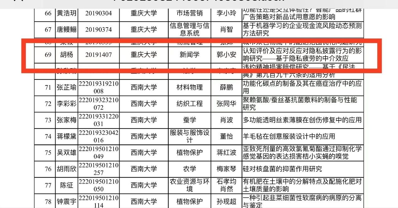 近日,重庆市教育委员会公布了2023年重庆市优秀本科生毕业论文(设计)评审结果,我院2023届本科生胡杨同学榜上有名,论文指导老师为郭小安教授。