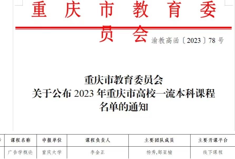 日前,重庆市教委发布了《重庆市教育委员会关于公布2023年重庆市高校一流本科课程名单的通知》(渝教高函78号)。经过高校自主申报、专家评议、复核与公示等多个环节,我院《广告学概论》课程成功入选重庆市高校一流本科线下课程。
