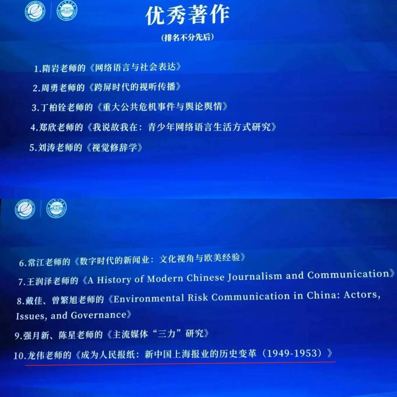 我院郭小安教授获得2021-2022年度“活跃的学术中坚”奖;龙伟教授的《成为人民报纸:新中国上海报业的历史变革(1949-1953)》获得“优秀著作”奖。我院11位学生获得2021-2022年度优秀学子奖,张心如、张媛获评为优秀本科生,方梓萱、符东、龚联康、胡艳娜、马晓晴、曾佳欣、朱珂欣获评为优秀硕士生,姜晓源和赵海明获评为优秀博士生。