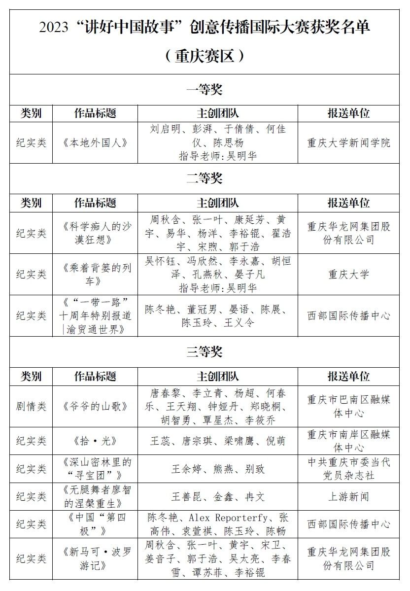 近日,由中国外文局主办,当代中国与世界研究院、中国互联网成人电影(中国网)承办的2023“讲好中国故事”创意传播国际大赛获奖作品名单正式出炉。本届大赛共评选出获奖作品98件,重庆赛区共10部作品上榜,分别获得一等奖、二等奖、三等奖。