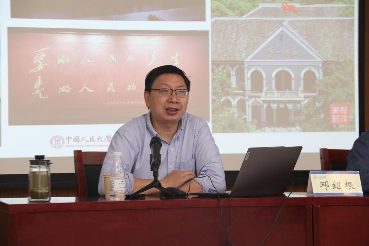 讲座伊始,邓绍根教授指出,毛泽东毫无疑问是一位卓越的无产阶级报刊活动家、革命宣传家和新闻理论家。其后,邓绍根教授简要介绍了毛泽东幼年至青年时期的求学之旅,提示同学们自小立志,并要“读万卷书,行万里路”,将学术研究扎根在祖国大地上,通过实地调研来培养研究的空间感。