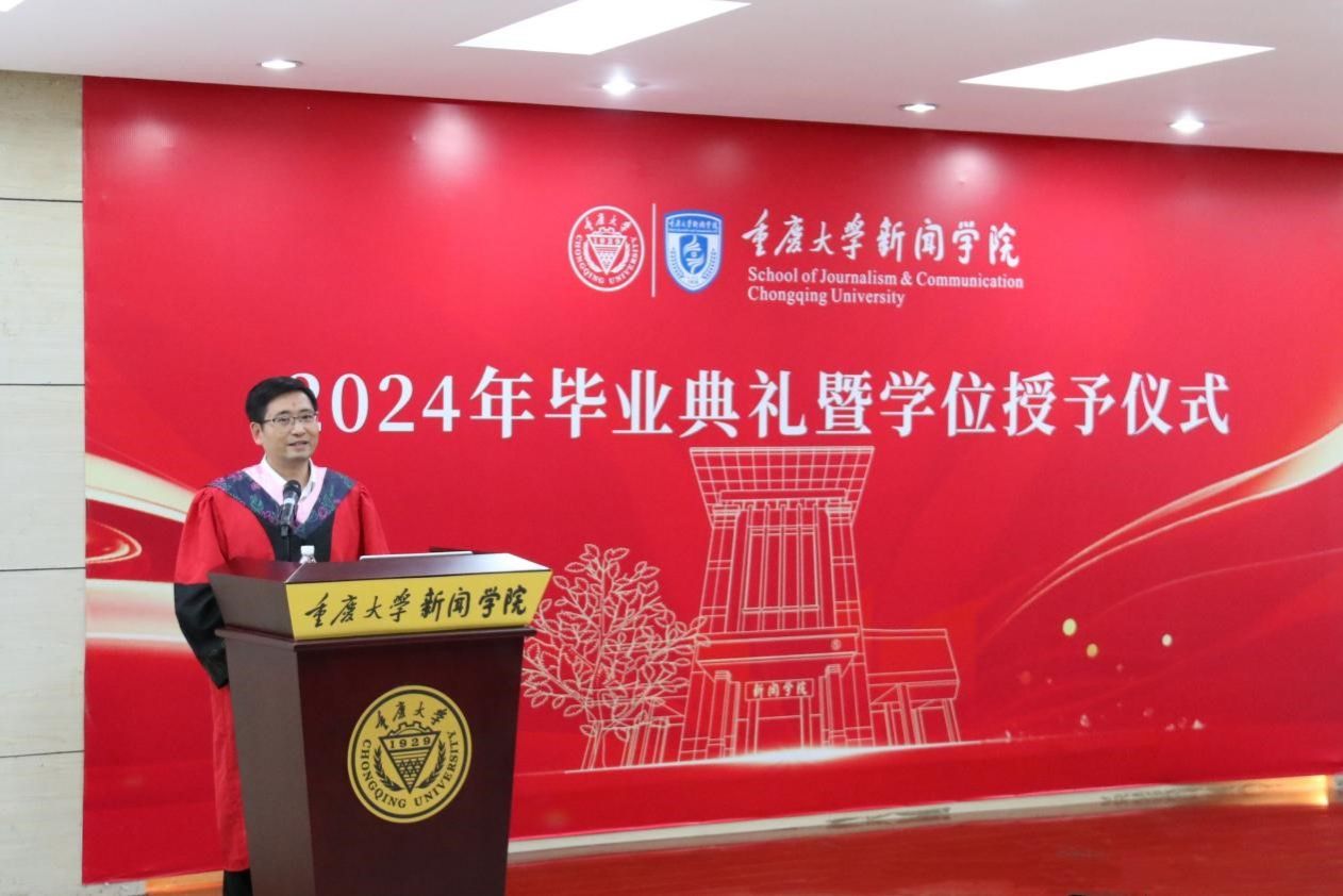 典礼在庄严的国歌声中拉开序幕。随后,院长郭小安发表致辞。他回顾了近年来学院在科学研究、学科建设、人才培养等方面取得的重大突破,勉励大家在未来的人生道路上继续保持求知若渴、拼搏向上的精神。并向全体毕业生提出三点殷殷寄语:一是始终保持对知识的热爱和追求,成为终身学习者;二是做一个有爱有用有趣的人,达则兼济天下,穷则独善其身,并保持一份业余爱好,善于从繁忙的工作中抽离,远离生活的琐碎,保持一份良知,用真诚去对待每一个人,保持一份清醒,不要人云亦云,更不能随波逐流,最后,还要保持一份个性与一份幽默;三是坚持新闻的敏锐性和职业操守,善于用自己的笔触记录时代的变迁和发展,同时还要铭记重大的办学宗旨——研究学术、造就人才、佑启乡邦、振导社会。最后,郭小安院长祝福毕业生们奔向星辰大海,开启新的人生,也希望毕业生们无论未来走向何方,都能记住,母校永远是精神家园。