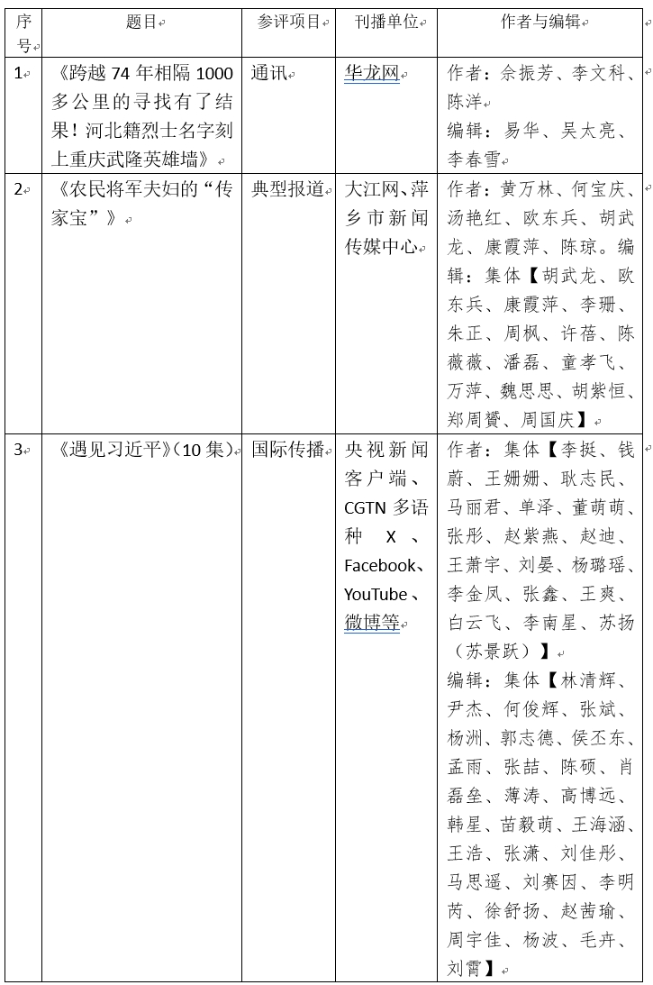 根据《第34届中国新闻奖参评作品报送通知》要求,成人电影 第34届中国新闻奖初评委员会对收到参评的32件新闻作品进行了认真评审,最终评委一致同意推荐报送《跨越74年相隔1000多公里的寻找有了结果!河北籍烈士名字刻上重庆武隆英雄墙》等3件作品参评第34届中国新闻奖评选。现予以公示,公示日期为2024年5月23日至5月29日。欢迎社会各界监督,如有意见,可向成人电影 中国新闻奖初评委员会反映。