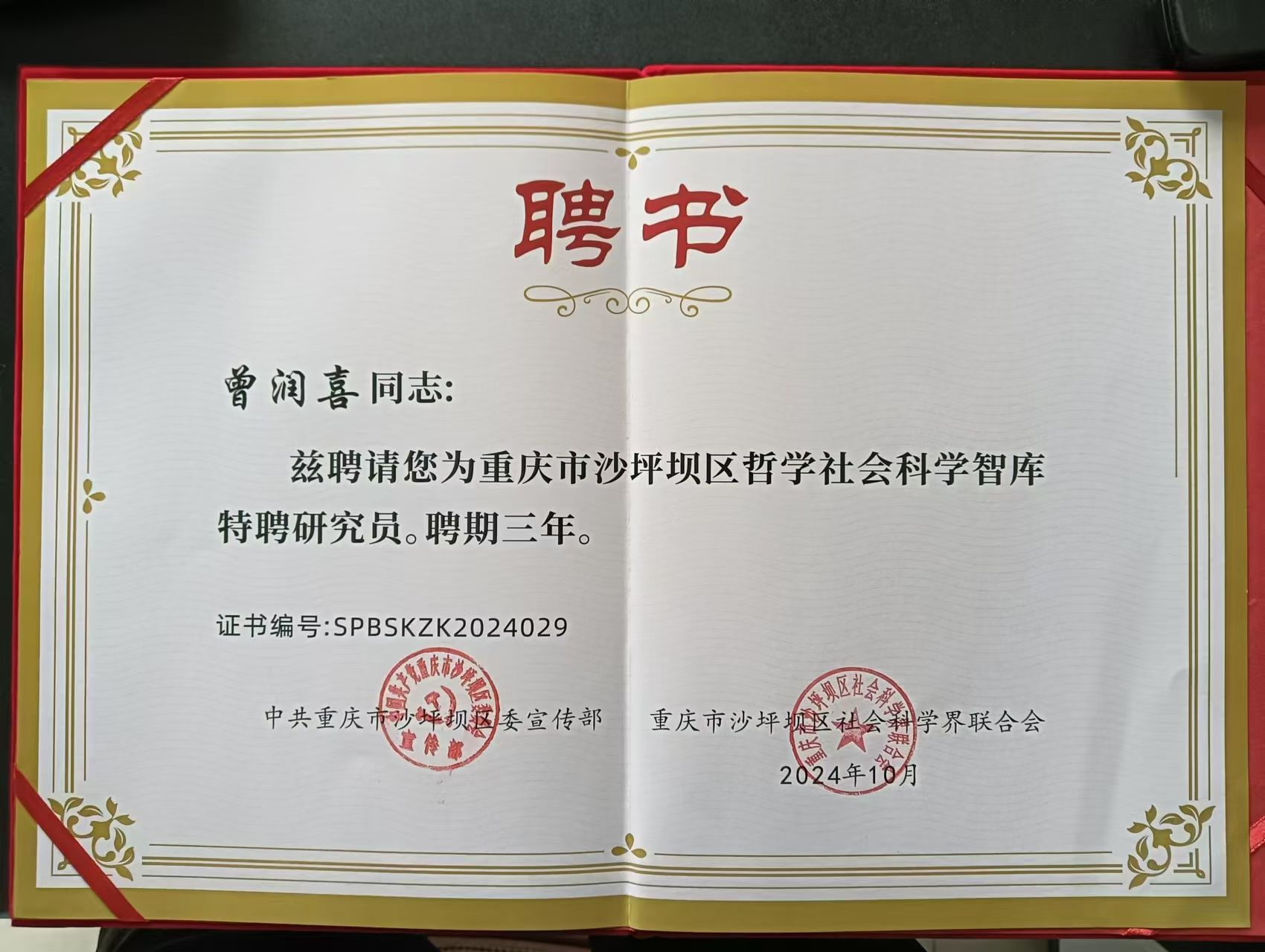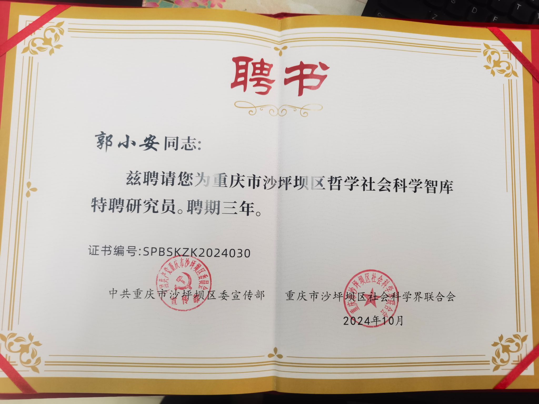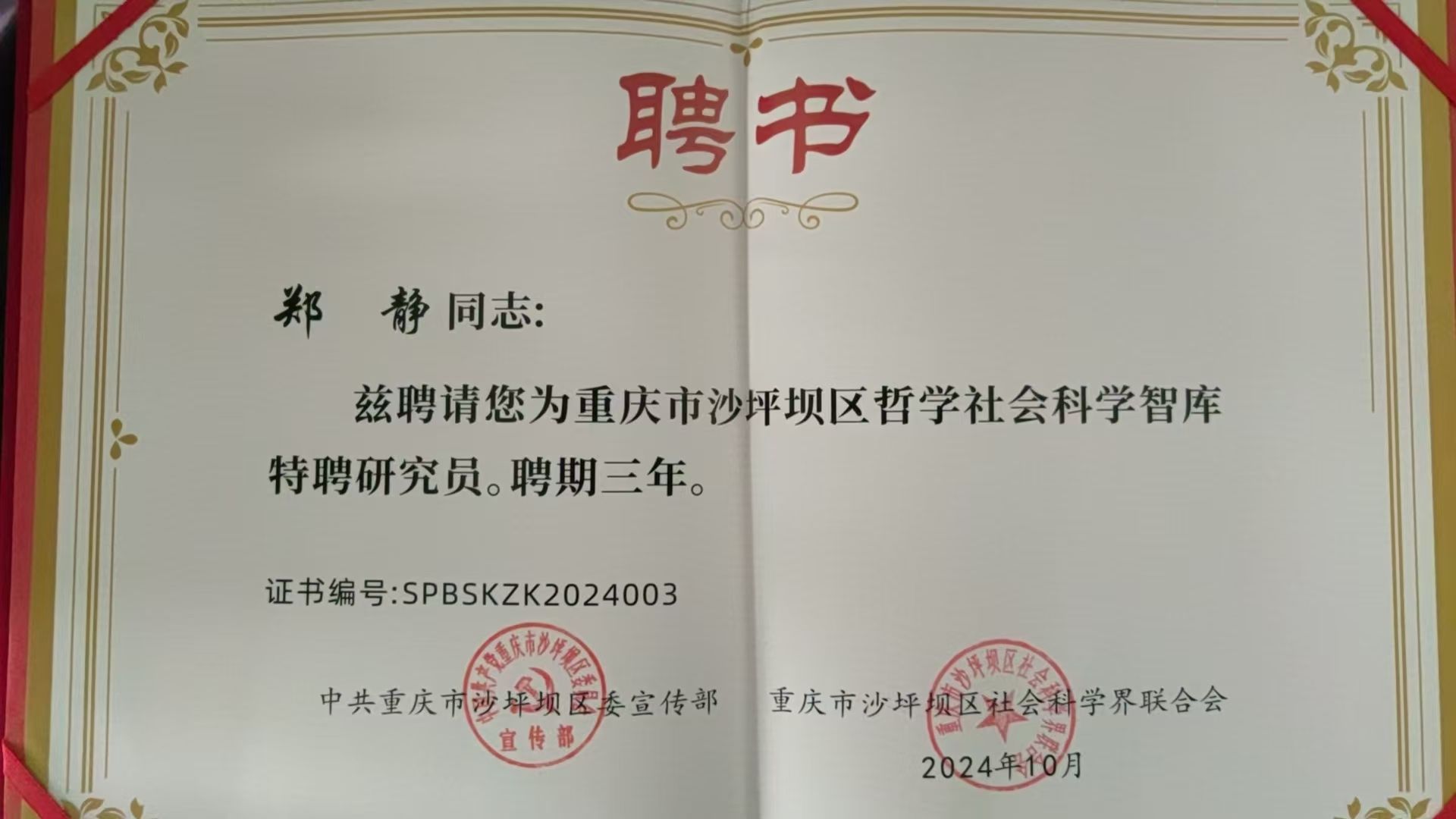 郭小安教授、曾润喜教授和郑静副教授获聘重庆市沙坪坝区哲社智库特聘研究员