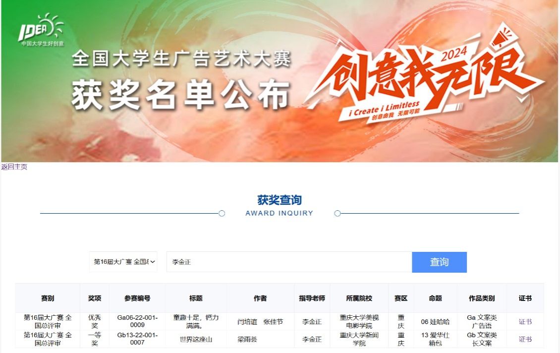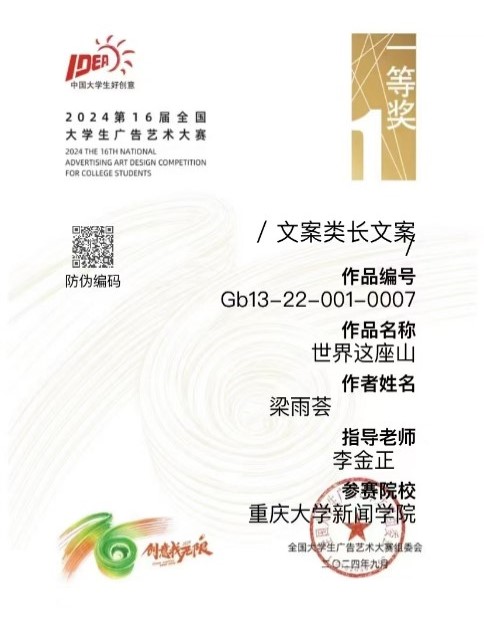 2024年9月,第十六届全国大学生广告艺术大赛(简称“大广赛”)全国总评审结果发布,成人电影 2021级本科生梁雨荟同学获得“文案类长文案”全国一等奖,指导老师为李金正老师。