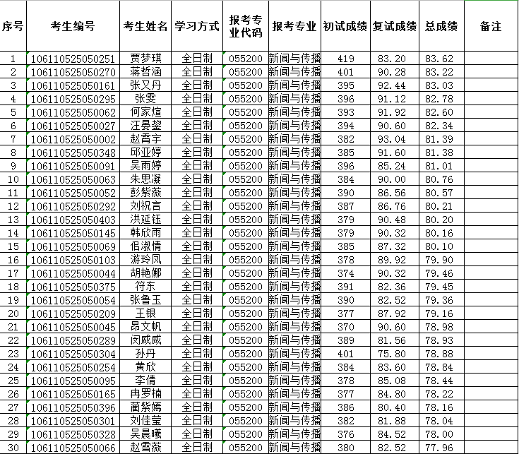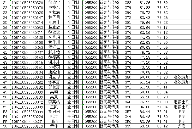 参加我院复试一志愿考生共有56名,目前学校下达录取名额如下:新闻与传播(专业学位)招生名额61名(其中已录取推免生15名),复试成绩及总成绩公示如下: