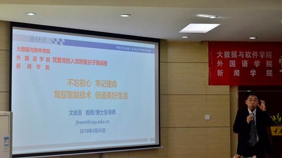 随后,由软件学院党委委员、副院长文俊浩教授,为学员们上了本期培训的第一课。文俊浩教授以"不忘初心,牢记使命,驾驭智能技术,创造美好生活"为题,紧扣党的十九大报告中的“智能化”方针,从国家战略,人工智能,智慧重庆等多个层次对同学们进行讲解,以深入浅出的方式,结合政治、经济、社会等维度,使同学们更加深刻认识到党的十九大精神实质。同时,文教授还从语言认知,自动写作等多个方面,将软件,外语,新闻的相关知识联系起来,让同学们认识到了专业间的融会贯通。