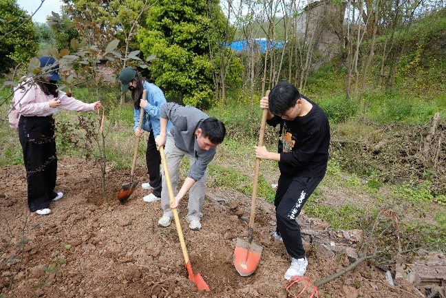 活动现场,同学们热情高涨,尽管烈日炎炎,但大家脸上都洋溢着青春的光彩。大家斗志昂扬、撸起袖子,以充足的动力、实干的精神投入到植树活动中。同学们三人成组,以锹为笔、以树为墨,将空地铺满象征着生态文明的绿色。大家挥锹铲土、扶苗培土、灌溉土壤……在讲解员的指导下,同学们有条不紊地完成每道工序,齐心协力栽种下树苗。最终,24棵树苗在泥土中挺立起来,焕发勃勃生机。