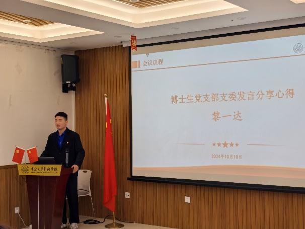 在发言分享环节,博士生党支部支委黎一达和周润哲同志分别进行了心得分享。他们结合个人经历和支部工作实际,畅谈了党支部建设的重要性和个人成长的体会,赢得了与会党员的热烈掌声。
