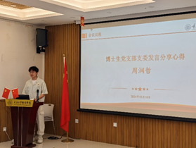 博士生党支部支委委员黎一达同志、周润哲同志在此次会议的发言分享环节中从自身经验出发,为四位支委候选人就如何做好支部建设提出了有效建议。发言中,两位同志还对今后不断加强博士生党支部与研究生各个支部之间的联系,发扬“传“”帮“带”精神的愿景提出了殷切期盼。